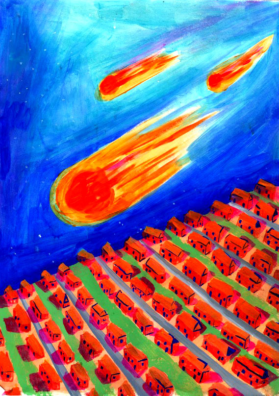 painting from the last image, comets at the moment just before they crash into a residential housing estate. The pink shadows don’t work very well and the orange/red combination of the roof/housing isn’t very successful. I do like the representation of an estate and the pattern of lines it creates, with the land cutting off at an angle. I also decided that I didn’t like the comets as a representation of the world ending.