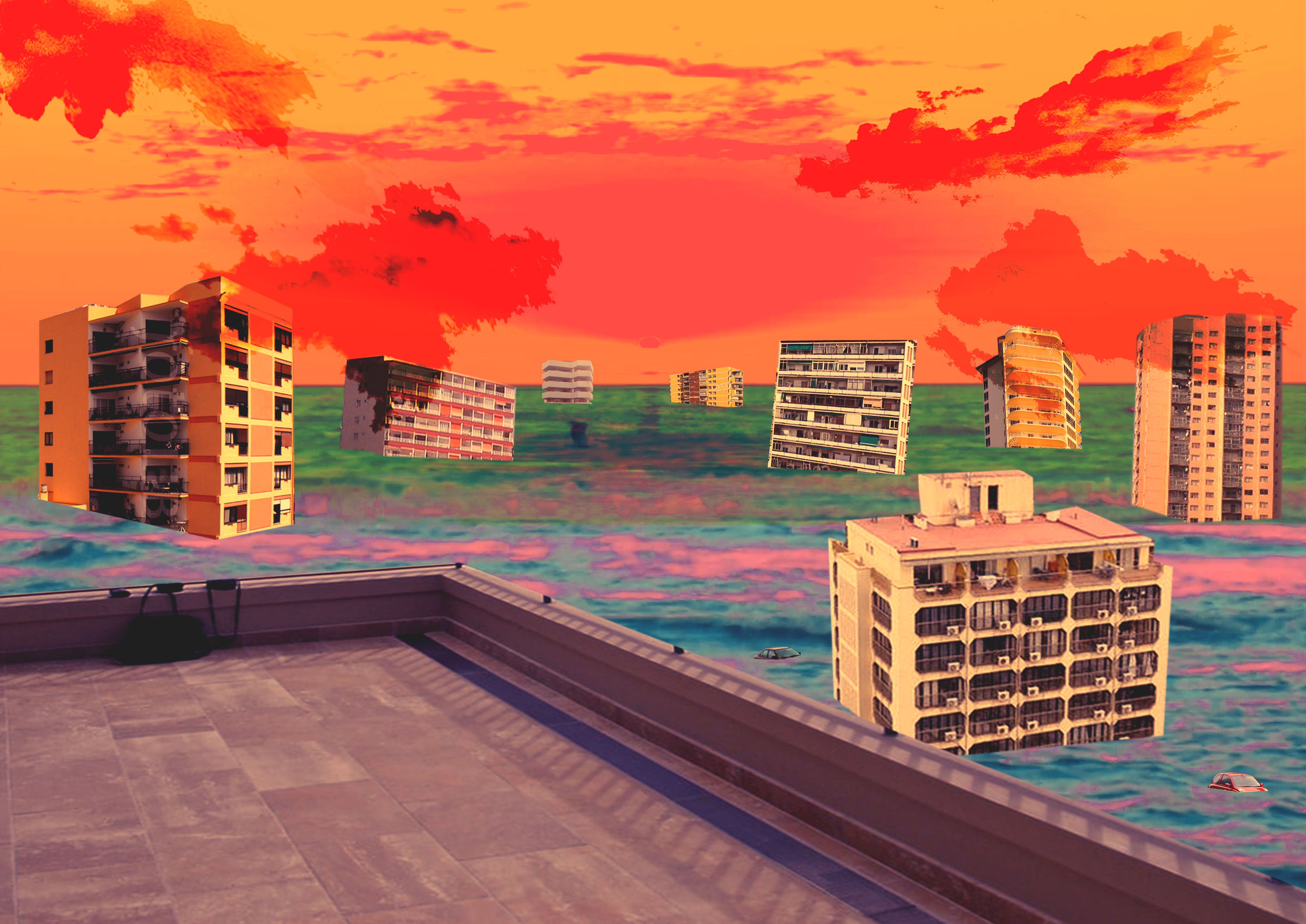 with this photoshop render I wanted to exaggerate the idea of “apocalypse” , adding comets and a red sky to create an end-of-days atmosphere. The people are sat on the hill, enjoying the view of the world ending before them. A romantic way to spend their last hours. I also wanted to maintain the hedonistic quality by adding two people having sex on a car behind them, still seeking pleasure until then end, spending their last moments in the height of human experience.