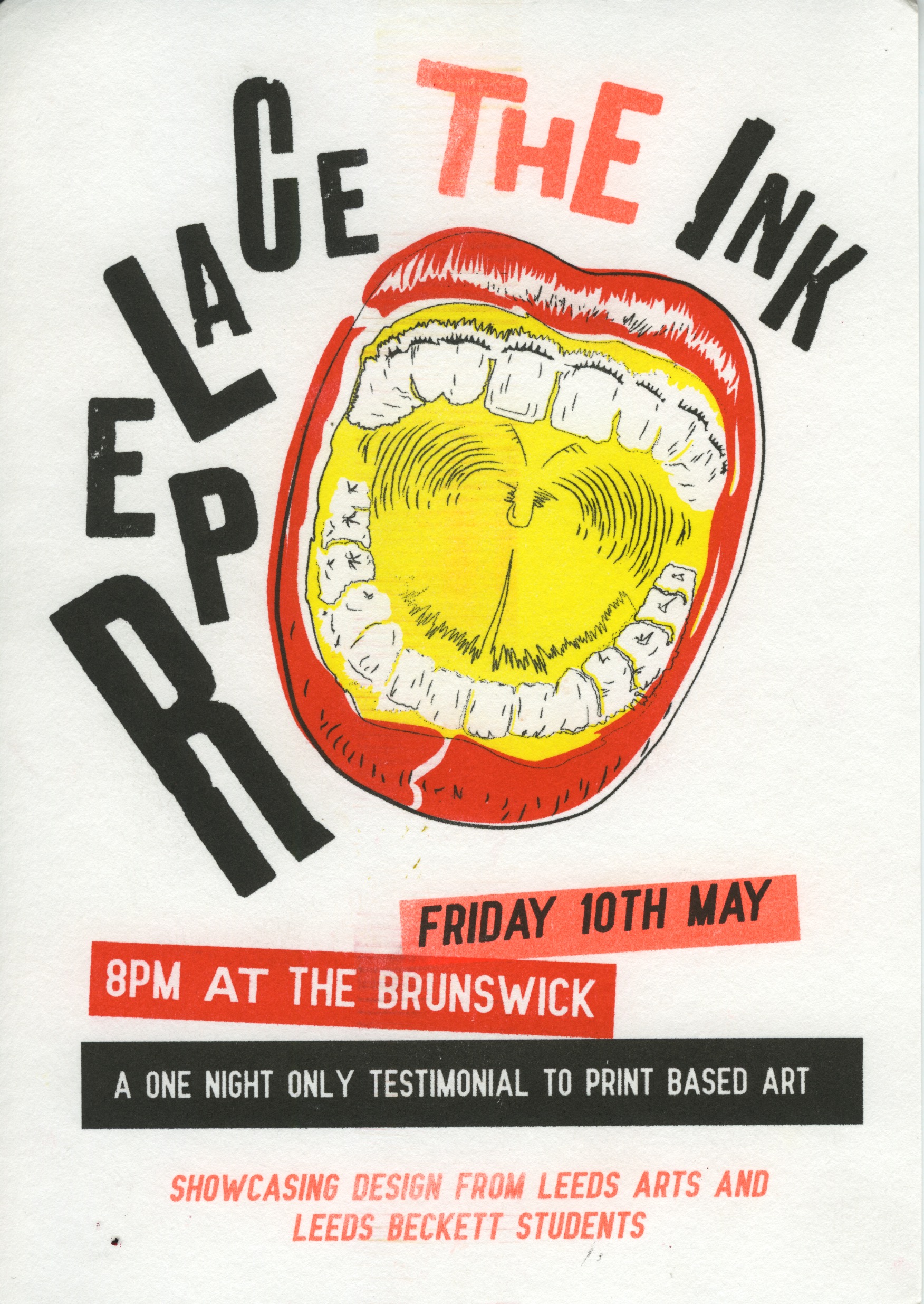 as a challenge to ourselves, myself and a good friend from leeds beckett graphic design decided we wanted to host our own exhibition. We decided to categorise the event as “print based art” making it easier for the work to be cohesive. It didnt take us long to come up with the name “Replace The Ink”. We collaborated on the event artwork and flyer design which my friend risograph printed.